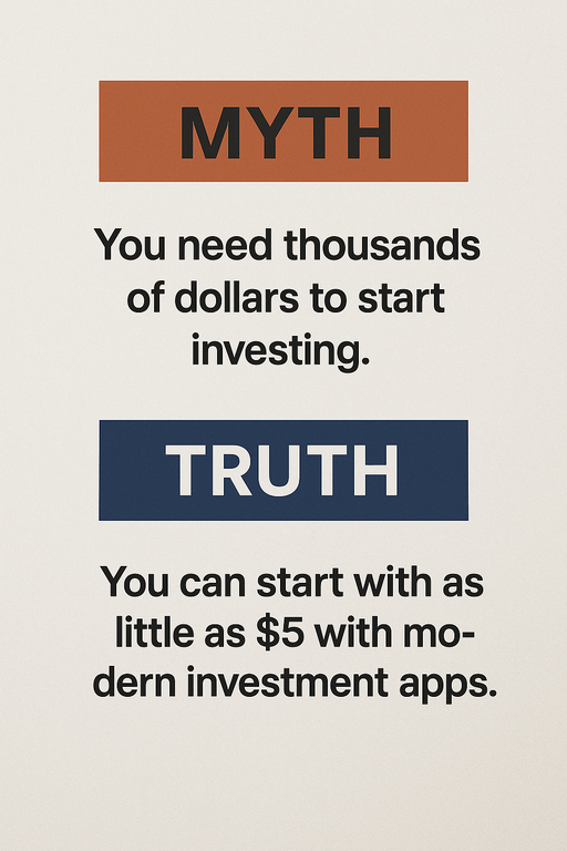 Create a myth-busting social media poster about investing. Use a bold “MYTH” and “TRUTH” format. Text: “MYTH: You need thousands of dollars to start investing. TRUTH: You can start with as little as $5 with modern investment apps.”