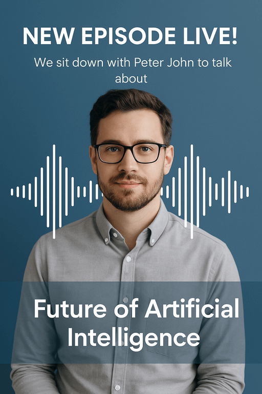 Create a clean and modern social media poster announcing a new podcast episode. Use an audiogram wave graphic over a photo of the guest speaker. Text: “New Episode Live! We sit down with Peter John to talk about “Future of Artificial Intelligence”.”