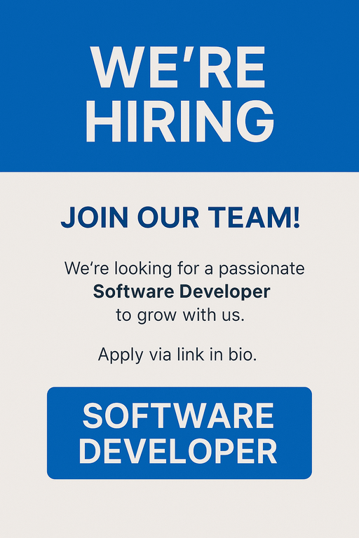 Create a professional “We’re Hiring” social media poster. Use a clean design and brand colors. Text: “Join Our Team! We’re looking for a passionate Software Developer to grow with us. Apply via link in bio.”