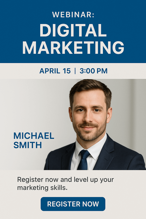 Create a professional and clean social media poster for a webinar on digital marketing. Use a professional headshot of the speaker and a clear, concise title. The text should include the date, time, and a call to action: “Register now and level up your marketing skills.”