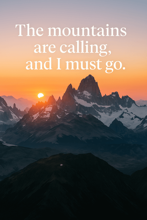 Create a breathtaking social media poster for a travel agency specializing in mountain expeditions. Use a stunning photograph of a mountain range at sunrise. The text should be “The mountains are calling, and I must go.”