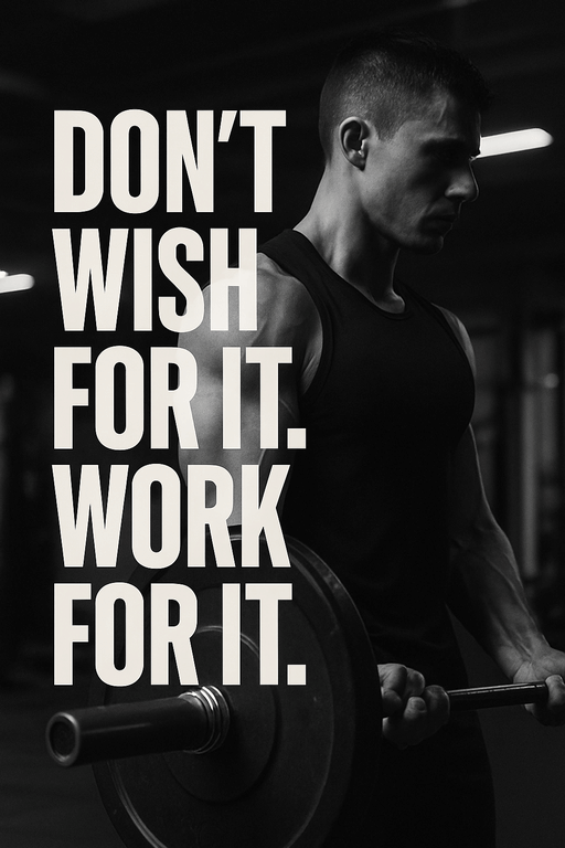 Create a motivational social media poster for a gym. Feature a powerful black and white photo of someone lifting weights. The text should be a bold quote: “Don’t wish for it. Work for it.”