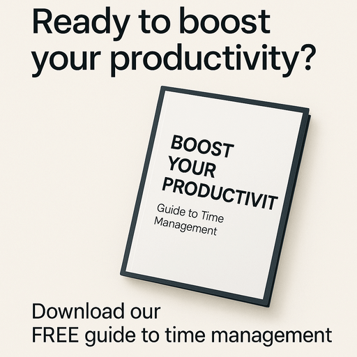 Create an engaging social media poster promoting a free downloadable guide. Feature a mockup of an e-book cover. Text: “Ready to boost your productivity? Download our FREE guide to time management.”
