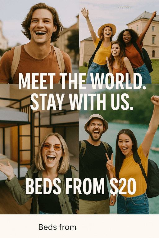Create a fun and quirky social media poster for a budget-friendly hostel. Use a collage of photos of travelers having fun. The text should be “Meet the world. Stay with us. Beds from $20.”