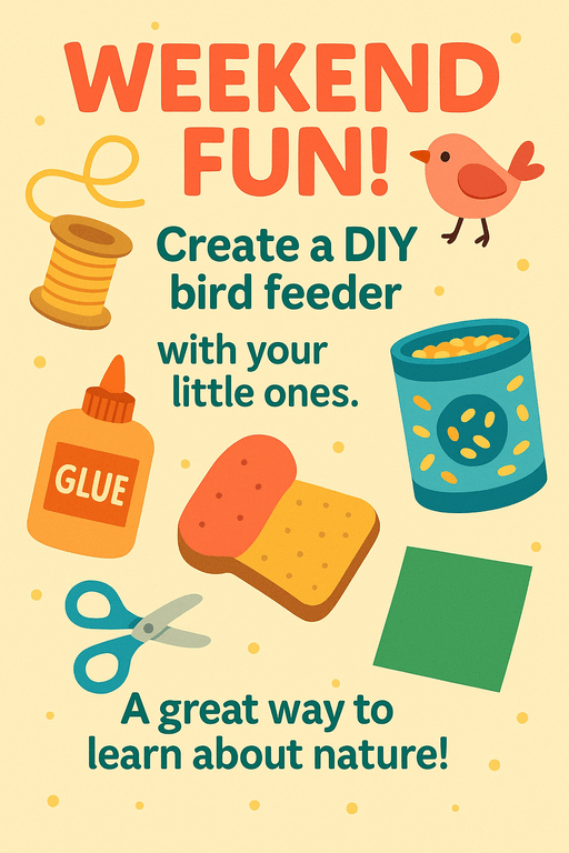 Create a playful and colorful social media poster for a weekend kids’ activity idea. Use illustrations of craft supplies. Text: “Weekend Fun! Create a DIY bird feeder with your little ones. A great way to learn about nature!”