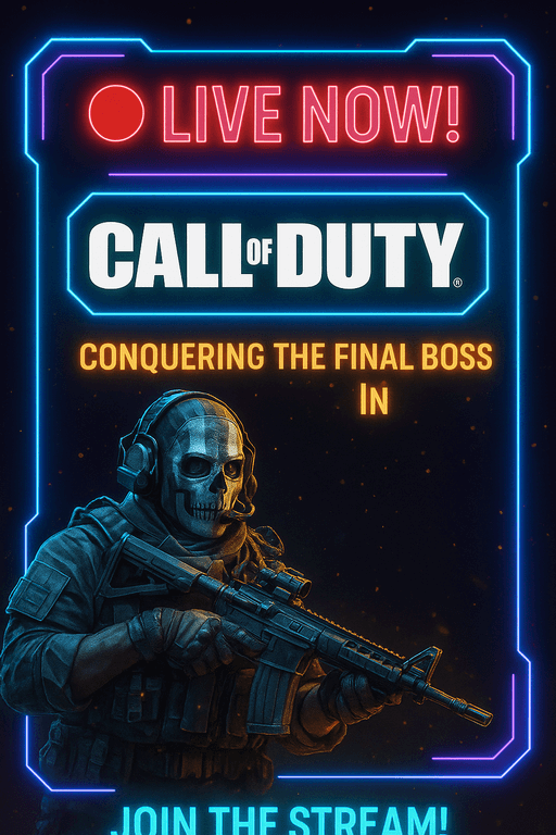 Create a dynamic, neon-infused social media poster for a gamer’s live stream. Use graphics and logos from the game being played. Text: “🔴 LIVE NOW! Conquering the final boss in [Game Name]. Join the stream!”