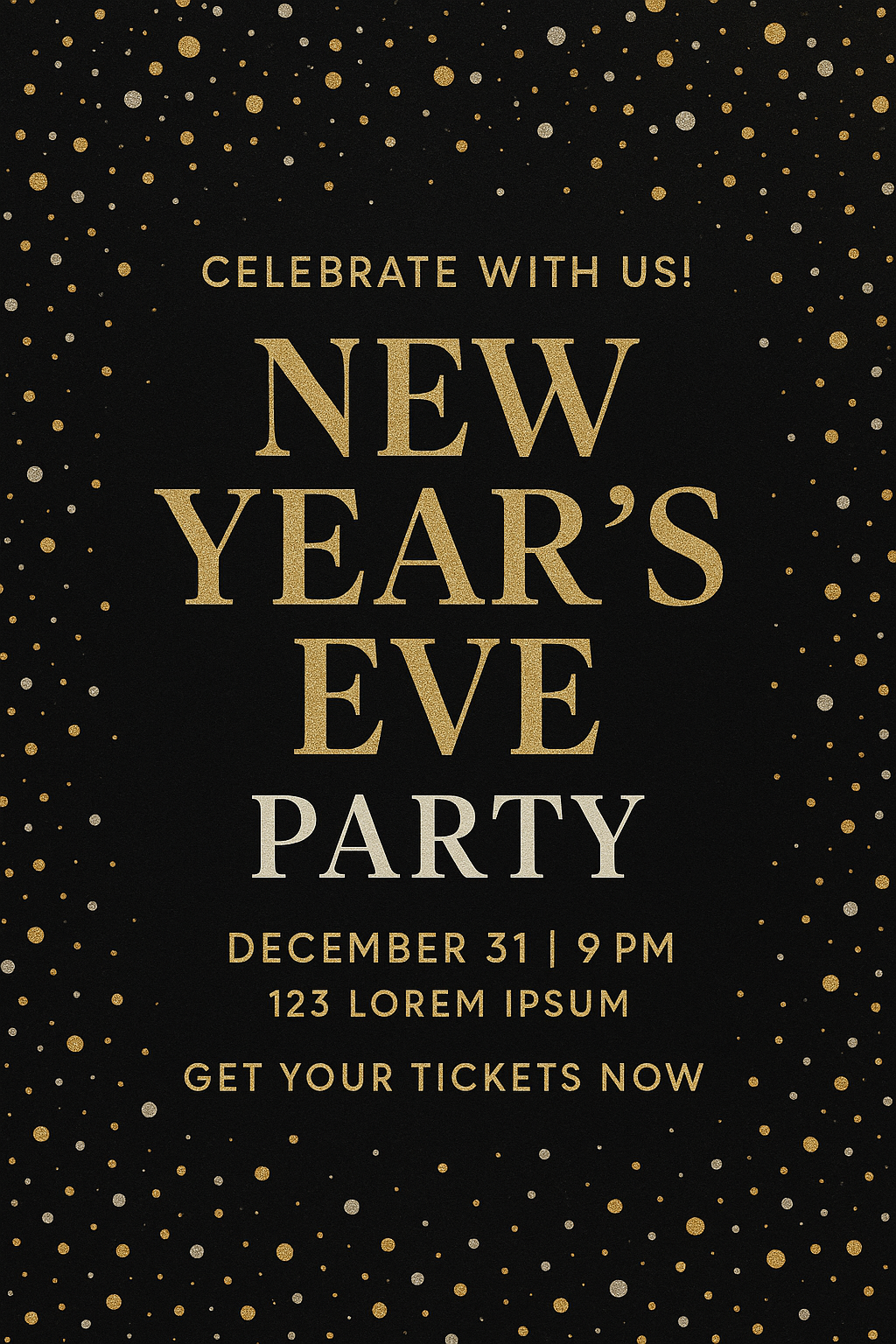 Create an elegant and festive social media poster for a New Year’s Eve party. Use a dark background with gold and silver confetti. The text should have all the event details and a call to action: “Celebrate with us! Get your tickets now.”