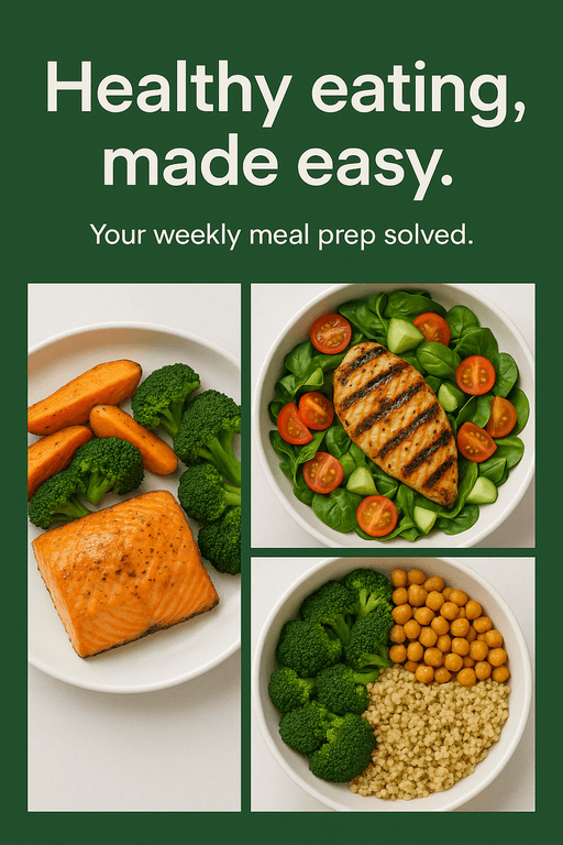 Create a modern and sleek social media poster for a healthy meal delivery service. Use a grid layout with images of three different healthy meals. The text should be “Healthy eating, made easy. Your weekly meal prep solved.”