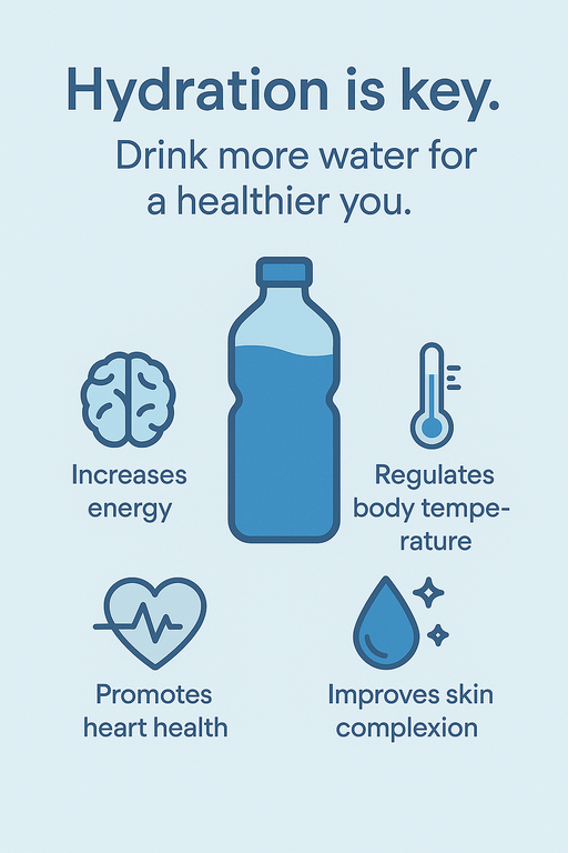 Create an informative social media poster about the benefits of hydration. Use icons and short, easy-to-read text blurbs. The main text should be “Hydration is key. Drink more water for a healthier you.”
