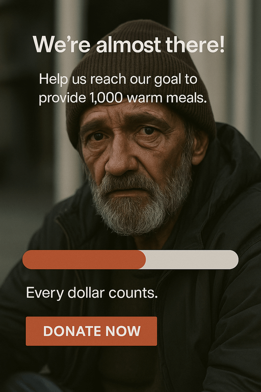Create a powerful and urgent social media poster for a fundraising drive. Use a compelling photo and a progress bar graphic. Text: “We’re almost there! Help us reach our goal to provide 1,000 warm meals. Every dollar counts. Donate now.”