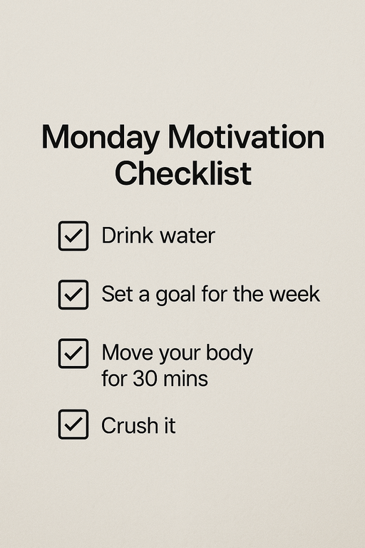 Create a social media poster that is a checklist for a specific goal. Use checkbox icons. Text: “Monday Motivation Checklist: ✔️ Drink water ✔️ Set a goal for the week ✔️ Move your body for 30 mins ✔️ Crush it.”