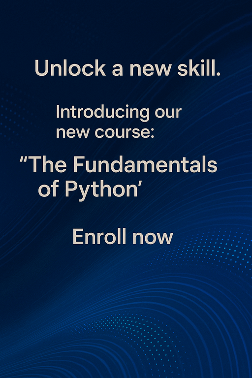 Create a professional social media poster announcing a new online course. Use an abstract, tech-inspired background with a clean layout. Text: “Unlock a new skill. Introducing our new course: ‘The Fundamentals of Python’. Enroll now.”
