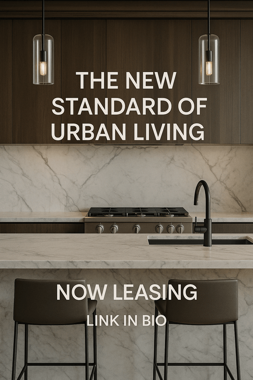 Create a modern and sleek social media poster for a new luxury apartment listing. Feature a high-quality photo of the kitchen with marble countertops. Text should read: “The new standard of urban living. Now leasing. Link in bio.”