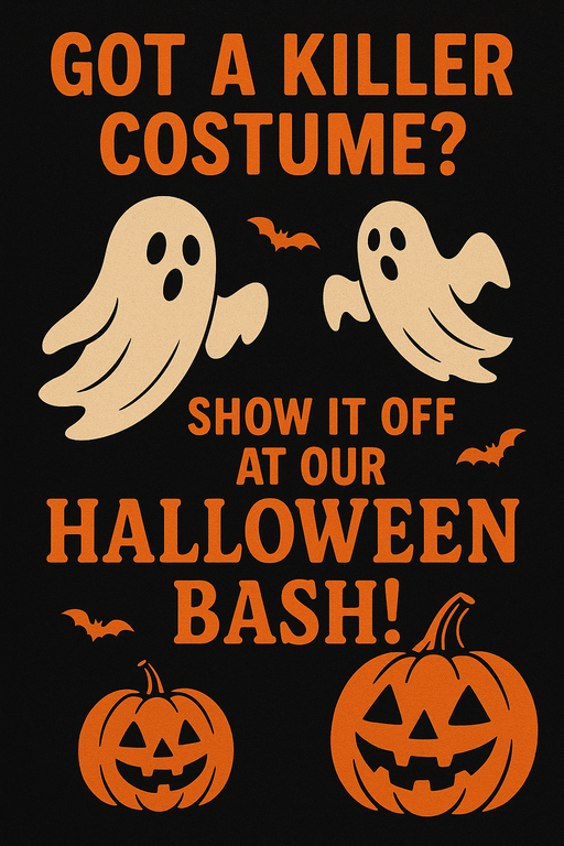 Create a spooky and fun social media poster for a Halloween costume contest. Use classic Halloween colors like orange and black, with illustrations of ghosts and pumpkins. The text should be playful: “Got a killer costume? Show it off at our Halloween bash!