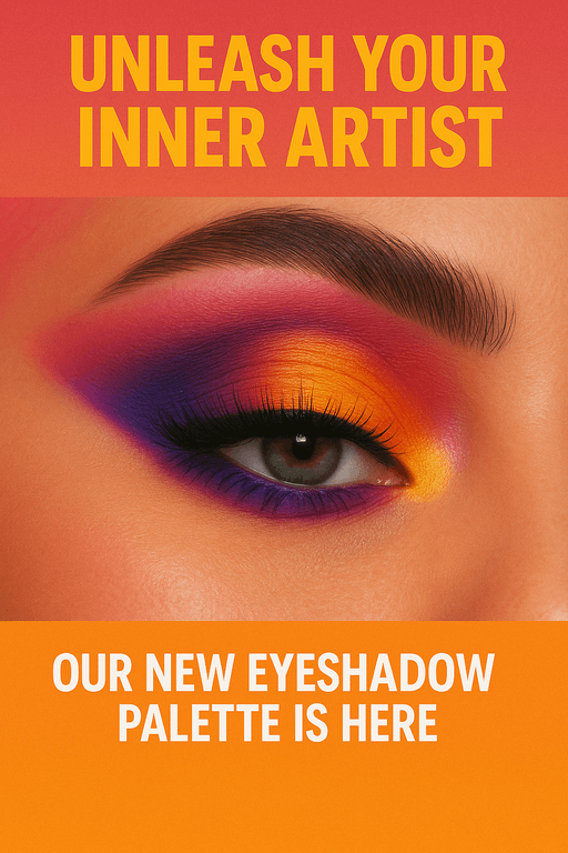 Create a bold and colorful social media poster for a makeup brand. Feature a close-up shot of a dramatic eye look. The text should be “Unleash your inner artist. Our new eyeshadow palette is here.”