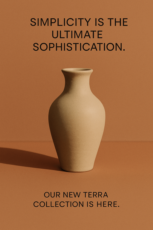Create a minimalist social media poster for a new product, like a ceramic vase. Feature the vase against a plain, colored background with interesting shadows. Text: “Simplicity is the ultimate sophistication. Our new Terra Collection is here.”