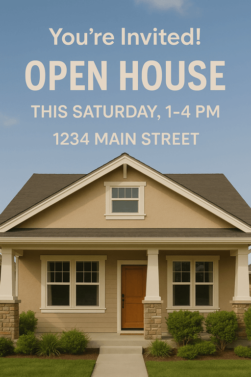 Create an inviting and friendly social media poster for an open house event. Use a warm photo of the home’s exterior with a clear blue sky. The text should be large and clear: “You’re Invited! Open House This Saturday, 1-4 PM.” followed by the address.