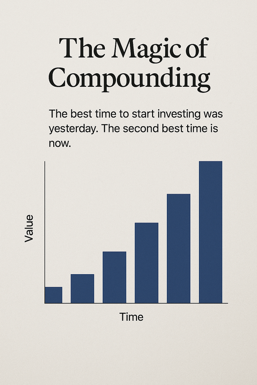 Create a social media poster designed as a simple bar graph showing the power of compound interest over time. Title it “The Magic of Compounding.” Text: “The best time to start investing was yesterday. The second best time is now.”.