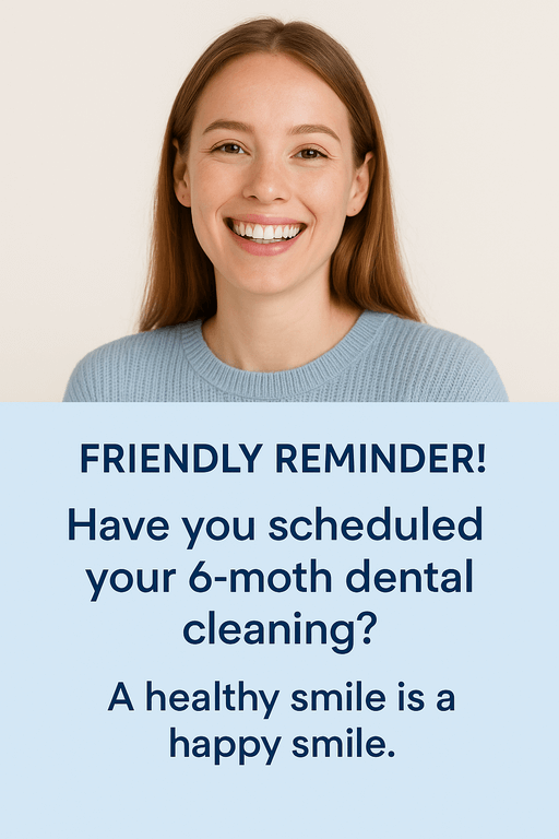 Create a fresh and clean social media poster for a dental clinic. Use a bright, smiling photo. Text: “Friendly Reminder! Have you scheduled your 6-month dental cleaning? A healthy smile is a happy smile.”