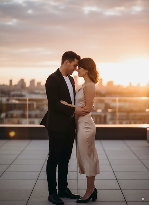 A stylish couple stands close together on a modern rooftop at golden hour, with the glowing orange and pink sky stretching behind them. The man wears a crisp black blazer with a white t-shirt and slim trousers, while the woman is in a silky champagne slip dress with her hair softly flowing in the breeze. They are leaning in, foreheads touching, with the city skyline blurred in the background. The photo is shot in portrait orientation with dreamy lens flare, giving a cinematic Instagram look.