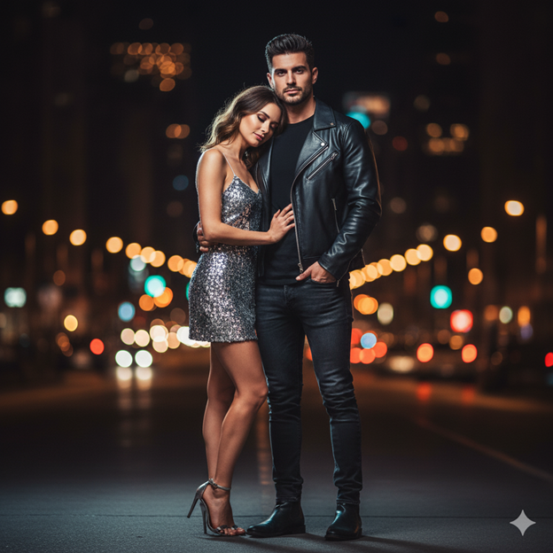 A stylish couple photographed at night against a backdrop of blurred city lights. The man wears a fitted black leather jacket with dark jeans, while the woman is in a sequined mini dress with strappy heels. She rests her head on his shoulder while he holds her waist. The photo is taken with a shallow depth of field, making the glowing bokeh lights pop in the background. The portrait feels glamorous and cinematic, perfect for Instagram nightlife aesthetics.