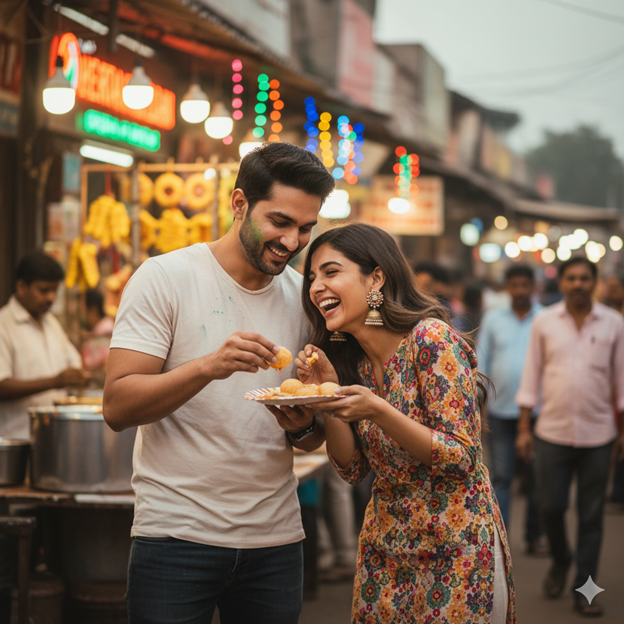 A candid portrait of the couple at a local street food stall in India. The man is in a casual t-shirt and jeans, while the woman is in a vibrant kurti with jhumkas. They are laughing while sharing a plate of pani puri, with blurred lights of the stall and colorful signboards in the background. The portrait is fun, relatable, and captures the everyday charm of Indian couples.