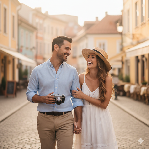 A candid couple photo at a European-style cobblestone street. The man is in a light blue button-down shirt with tan trousers, holding a vintage film camera. The woman wears a white sundress with a wide-brim hat, holding his arm as they laugh together. The portrait is framed to include charming pastel-colored buildings in the blurred background, with soft daylight creating a romantic, travel-blog style effect.