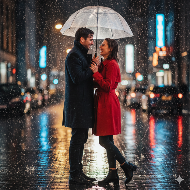 A romantic portrait of the couple standing close under a clear umbrella as raindrops fall around them. The man is in a dark navy coat with the collar turned up, while the woman wears a red trench coat with glossy boots. They’re laughing together, their faces softly lit by nearby streetlights. The blurred background shows wet pavement reflecting neon colors, creating a cinematic rainy-night vibe.