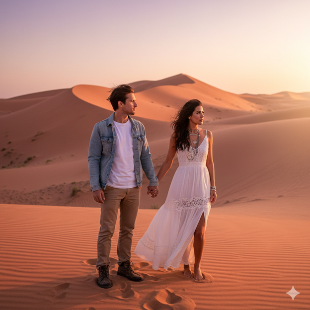 A stylish couple poses in the middle of a desert landscape during sunset. The man wears a white t-shirt layered with a denim jacket and khaki pants, while the woman is in a bohemian flowy white dress with layered jewelry. She is barefoot, holding his hand as they look into the distance with the glowing orange dunes behind them. The portrait captures wide open space, wind in their hair, and dreamy wanderlust aesthetics.