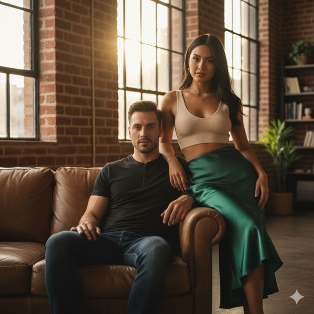 The couple is photographed indoors in a stylish industrial loft with exposed brick walls and large windows. The man wears a fitted black henley with dark jeans, while the woman is dressed in a silky satin slip skirt with a tucked-in crop top. They are leaning against each other on a leather sofa, with warm sunlight streaming through the window behind them. The portrait composition feels urban, moody, and very Instagram-modern.