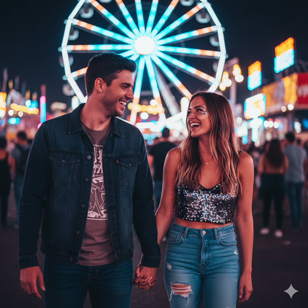 A candid portrait of the couple at a nighttime festival. The man is in a casual graphic tee layered with a denim jacket, while the woman wears glittery eye makeup, a sequined top, and ripped jeans. They’re holding hands and laughing, surrounded by glowing Ferris wheel lights and neon signs in the blurred background. The portrait is dynamic, colorful, and energetic, giving a fun social-media vibe.