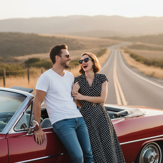 A cinematic portrait of the couple leaning against a vintage convertible car parked on a quiet road. The man is wearing a plain white t-shirt tucked into jeans with aviator sunglasses, while the woman is in a polka-dot retro dress with red lipstick and cat-eye sunglasses. They’re laughing together, with the car door open and a wide scenic view blurred in the background. The photo feels timeless, nostalgic, and Instagram-classic.