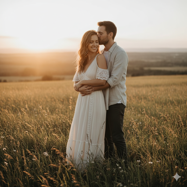 A breathtakingly romantic, photorealistic portrait of a couple deeply in love, standing in a vast meadow of tall grass and wildflowers at sunset. The woman is wearing a flowing, off-white bohemian maxi dress with delicate lace details, her hair styled in soft waves with a few loose strands catching the light. The man is wearing a casual, unbuttoned light linen shirt over a simple t-shirt and dark chinos. He is gently holding her from behind, his arms wrapped around her waist, whispering something in her ear that makes her smile with her eyes closed. The scene is bathed in the warm, golden light of the setting sun, creating a beautiful lens flare and long, soft shadows. The background is a soft-focus vista of rolling hills and a hazy, pastel-colored sky. The overall mood is serene, intimate, and profoundly romantic.