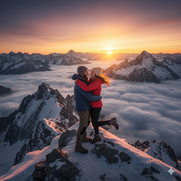 An epic and awe-inspiring portrait of an adventurous couple locked in a passionate embrace on the summit of a rugged, snow-dusted mountain at sunrise. They are dressed in stylish and practical hiking gear—puffer jackets, beanies, and hiking boots. The wind gently whips through her hair as he lifts her slightly off the ground in a joyful hug. All around them is a breathtaking 360-degree panorama of sharp mountain peaks piercing through a sea of soft morning clouds below. The rising sun paints the sky in vibrant shades of orange, pink, and purple, casting a warm, heroic light upon them. The air is crisp and clear. The photo captures a feeling of exhilaration, freedom, and a love as grand as the landscape. Cinematic wide shot, National Geographic style, hyperrealistic, dramatic lighting, immense scale.