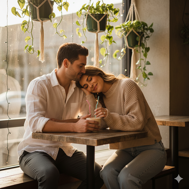 The couple sits at a small rustic café table by a large window, warm sunlight pouring in. The man wears a casual white shirt with rolled-up sleeves, while the woman wears an oversized beige sweater and light blue jeans. She’s leaning playfully on his shoulder as they share a coffee cup with two straws. The background has blurred hanging plants and fairy lights. The portrait framing captures their joyful, intimate expressions in a warm, moody tone, perfect for a cozy social media post.