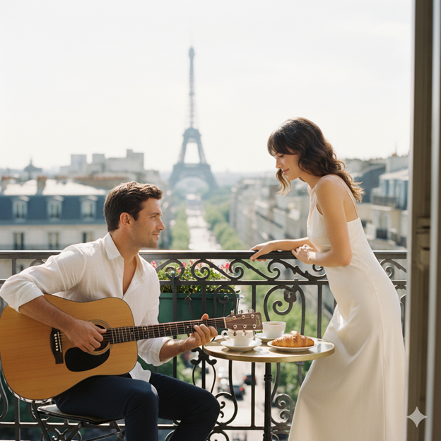 A beautifully composed, sun-drenched portrait of a chic couple on a classic Parisian wrought-iron balcony. It’s a bright morning, and the city of Paris, with the Eiffel Tower faintly visible in the distance, serves as the stunning backdrop. The man is playing a gentle melody on an acoustic guitar for the woman, who is leaning against the balcony railing, looking at him with pure adoration. She is wearing a simple but elegant silk slip dress, and he is in a crisp white shirt with the sleeves rolled up. A small table with a fresh croissant and a cup of coffee sits nearby. The scene is filled with bright, natural light, creating a fresh, airy, and effortlessly romantic atmosphere.