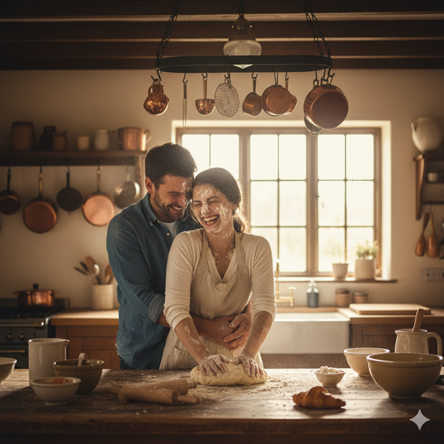 A warm and candid portrait of a couple playfully cooking together in a rustic, sunlit farmhouse kitchen. They are in the middle of baking, with a light dusting of flour on their faces and clothes. He is standing behind her, his arms wrapped around her as they both knead dough on a wooden countertop. They are laughing, their heads close together, sharing a joyful, unposed moment. The kitchen is cozy and charming, with wooden beams, copper pots hanging from a rack, and a large window letting in soft morning light. The atmosphere is filled with authentic happiness and the simple beauty of shared life.