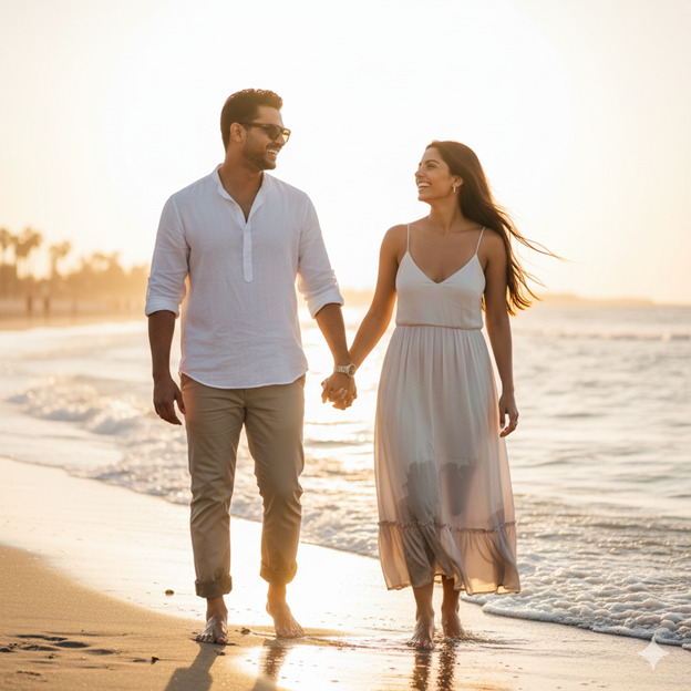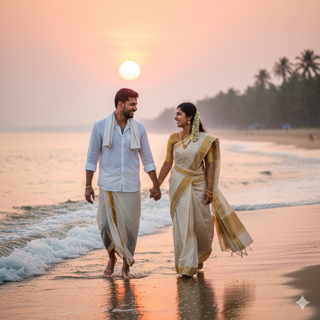 A couple walks barefoot on a Kerala beach at sunset. The man is dressed in a simple white mundu and linen shirt, while the woman wears a cream-and-gold Kerala saree with jasmine flowers in her hair. They hold hands, smiling naturally as waves crash gently behind them. The portrait captures a mix of tradition and modern romance, set against a glowing orange sky.