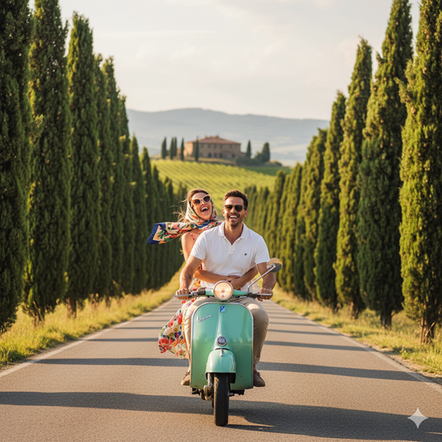 A vibrant, sun-drenched portrait of a laughing couple riding a vintage mint-green Vespa down a narrow, cypress-lined country road in Tuscany, Italy. The woman is seated behind the man, her arms wrapped happily around his waist and her head tilted back in a joyful laugh. She is wearing a beautiful floral sundress and oversized sunglasses, with a silk scarf tied in her hair, fluttering in the wind. He is wearing a classic white polo shirt and beige trousers, smiling as he drives. The scene is bathed in the warm, late afternoon Italian sun, creating a golden glow. The background is a picturesque landscape of rolling hills, vineyards, and a distant stone farmhouse. The photo captures a feeling of pure, unadulterated happiness and carefree romance.