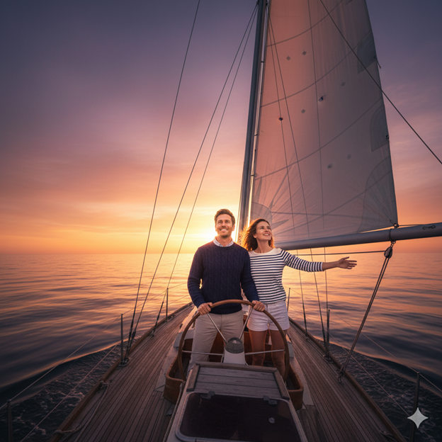 A stunning and serene portrait of a couple on the deck of a classic wooden sailboat, sailing across a calm ocean at sunset. The sky is a magnificent gradient of fiery orange, deep purple, and soft pink, reflected perfectly on the water’s surface. The man is at the helm, confidently steering the boat, while the woman stands beside him, one hand on his shoulder and the other pointing towards the horizon, a look of peaceful wonder on her face. The wind gently fills the large white sail and tosses their hair. They are dressed in classic, nautical attire—a navy blue sweater for him, a striped shirt for her. The image evokes a sense of freedom, adventure, and the profound beauty of navigating life together. Cinematic, epic golden hour lighting, wide-angle shot to capture the vastness of the sea and sky.