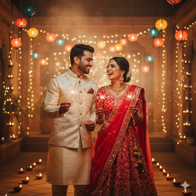 A couple stands side by side during Diwali celebrations. The man wears a cream kurta with a Nehru jacket, while the woman is in a bright red lehenga with gold embroidery. They hold sparklers in their hands, laughing as the lights glow around them. The background shows hanging lanterns and diyas softly illuminating the scene. The portrait captures warm, festive tones and a joyful Indian vibe.