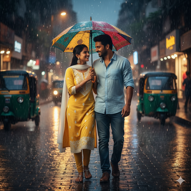 The couple is photographed on a quiet Indian street after rainfall. The man wears a light blue shirt with sleeves rolled up and dark jeans, while the woman is in a bright yellow kurti with leggings. They share a colorful umbrella, leaning close as raindrops fall around them. Reflections shimmer on the wet road, with blurred auto-rickshaws and streetlights in the background, creating a cinematic monsoon portrait.