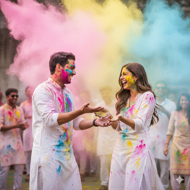 A vibrant portrait of the couple during Holi celebrations. The man wears a plain white kurta now splashed with bright colors, while the woman is in a white salwar suit covered in playful Holi powder. They laugh as they throw colors at each other, the background filled with blurred friends and clouds of pink, yellow, and blue powder. The portrait bursts with energy, fun, and celebration.