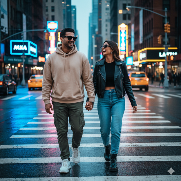 A candid portrait of a fashionable couple walking hand-in-hand across a busy city crosswalk. The man is in a relaxed oversized hoodie with cargo pants and sneakers, while the woman wears a crop top with a leather jacket and high-waisted jeans. Both are wearing sunglasses, laughing naturally as if caught mid-conversation. The background captures blurred neon signs and city cars, giving the photo a cool, modern, and urban Instagram street-style look.