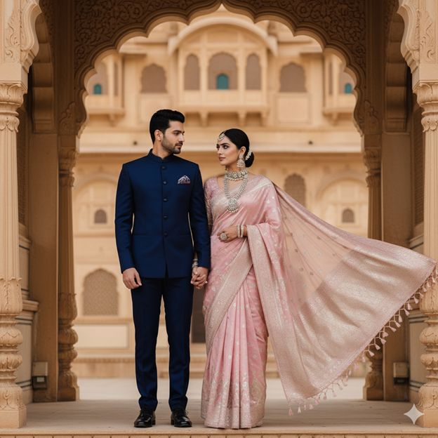 The couple poses in front of a grand Rajasthani palace archway. The man is dressed in a deep blue bandhgala suit, while the woman is in a pastel pink saree with heavy silver jewelry. They stand close, with her dupatta flowing in the wind, and the palace’s intricate carvings blurred behind them. The portrait feels royal, romantic, and perfect for luxury Indian Instagram content.