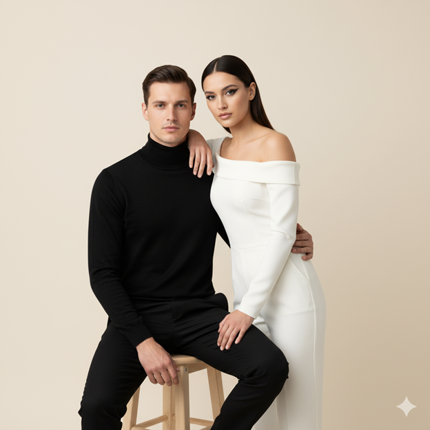 The couple is photographed against a minimalist cream backdrop in a professional studio. The man sits on a wooden stool wearing a tailored black turtleneck and fitted trousers, while the woman leans against him, dressed in a white off-shoulder jumpsuit with sleek makeup and bold eyeliner. Their pose is elegant yet relaxed, with subtle lighting highlighting their features. The portrait is styled like a modern magazine editorial, clean and Instagram-aesthetic.