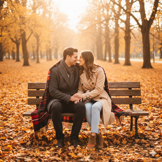 A cozy outdoor portrait of the couple in a park filled with golden autumn leaves. The man wears a warm wool coat in charcoal gray with a scarf, while the woman is in a beige trench coat and ankle boots. They are wrapped together under one plaid blanket, sitting on a wooden bench with colorful fallen leaves scattered around them. The portrait captures the soft golden light filtering through the trees, giving a dreamy, romantic fall vibe.