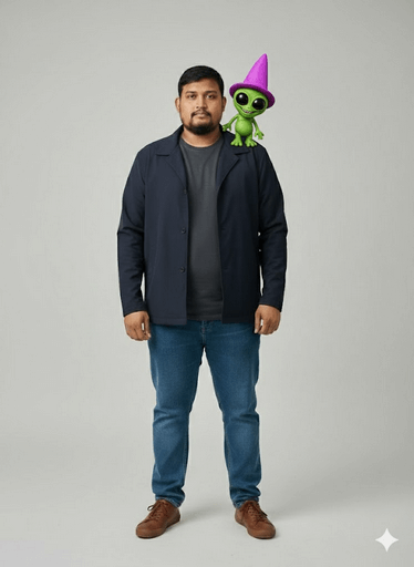 Prompt I used: Add a funny alien character to this photo. It should be sitting on his shoulder.