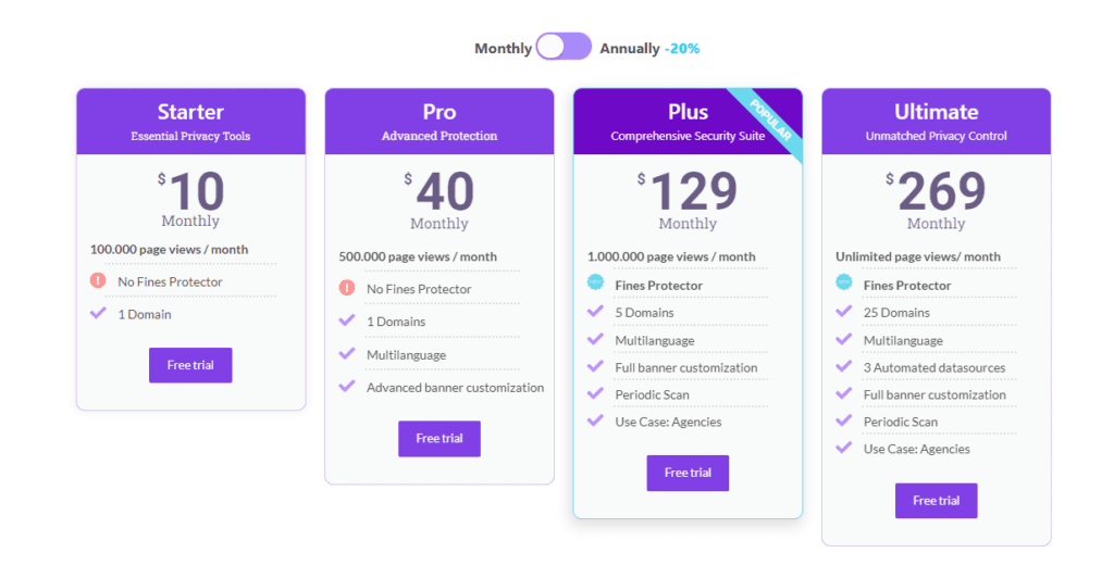 | Plan | Features | Price | Page Views per Month | Fines Protector | Domains | Multilanguage | Advanced Banner Customization | Full Banner Customization | Periodic Scan | Use Case: Agencies | Free Trial |