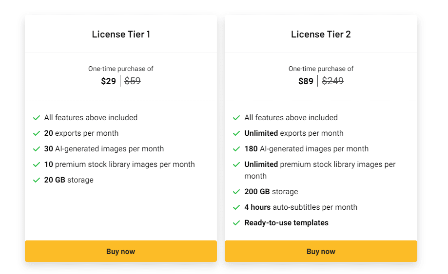 | License Tier 1 Features | – 20 exports per month – 30 AI-generated images per month – 10 premium stock library images per month – 20 GB storage |